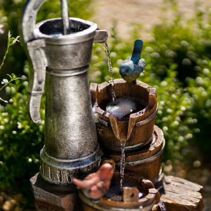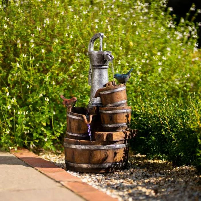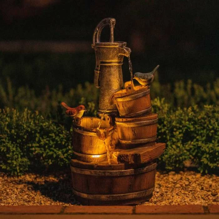Blue and red birds on buckets and barrels, bathing/basking by sun-powered streams flowing from pump to pool. Made from UV- and frost-resistant polyresin (to resist life’s wear and tears) this feature’s sure to be a garden focal point for years to come, and all it needs is a sunny spot to get the water flowing. And, with LED lights to illuminate the water flow and feature, you can enjoy every part of this fountain come day or night (with battery backup!).