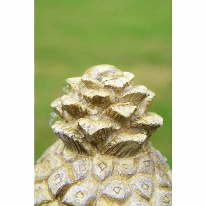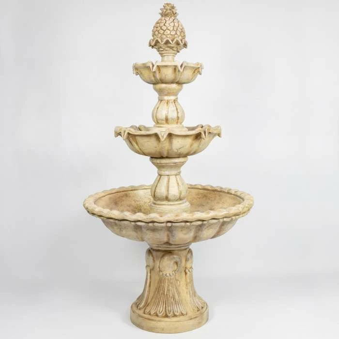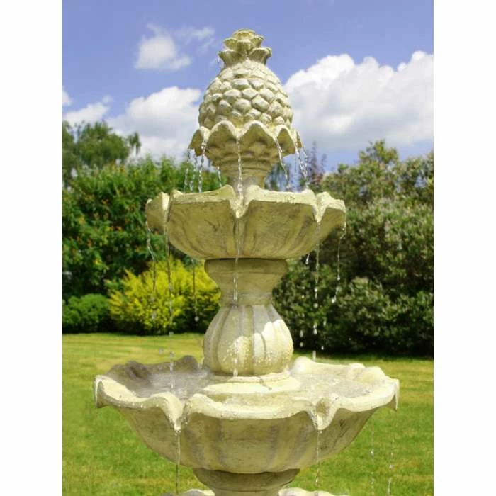 The water circulates from a reservoir hidden inside the feature and is pumped out of the pineapple on the top of the fountain, before gently spilling down through the final tier, ready to be pumped back up to start the cycle all over again.